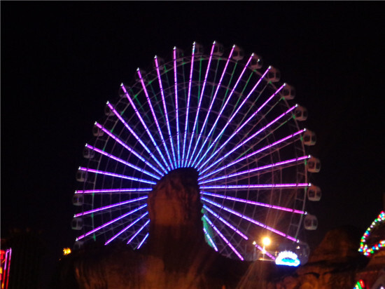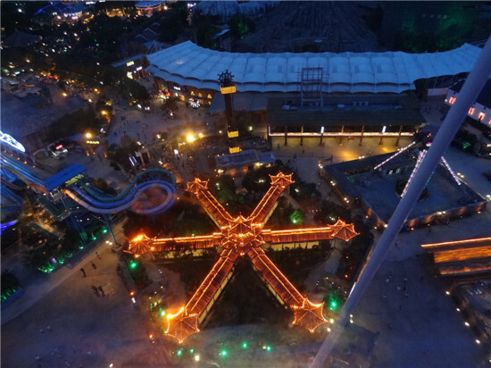 排了半個小時的隊,終于坐上了摩天輪,在摩天輪最頂端看到的夢幻谷,格外美麗