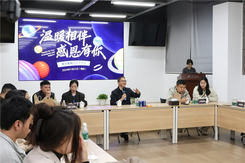 家庭開放日座談會環節,徐平炬董事長以真摯的情感與開放的態度,與大家深入交流。他首先表達了誠摯的歡迎與感謝,分享了集團從2006年僅有200余名員工,達成首個億美元里程碑,到如今向著4000人團隊、百億美金目標邁進的歷程。徐總強調,賽爾的每一步成長都離不開員工的辛勤付出與家人的默默支持,這份力量是推動賽爾不斷演進的強大動力。徐總還認真聽取了員工家庭對集團發展、員工福利、文化建設等方面的寶貴意見和建議,并就集團義烏總部新大樓項目進展、員工福利、社媒管理、停車改善等問題進行了一一解答。